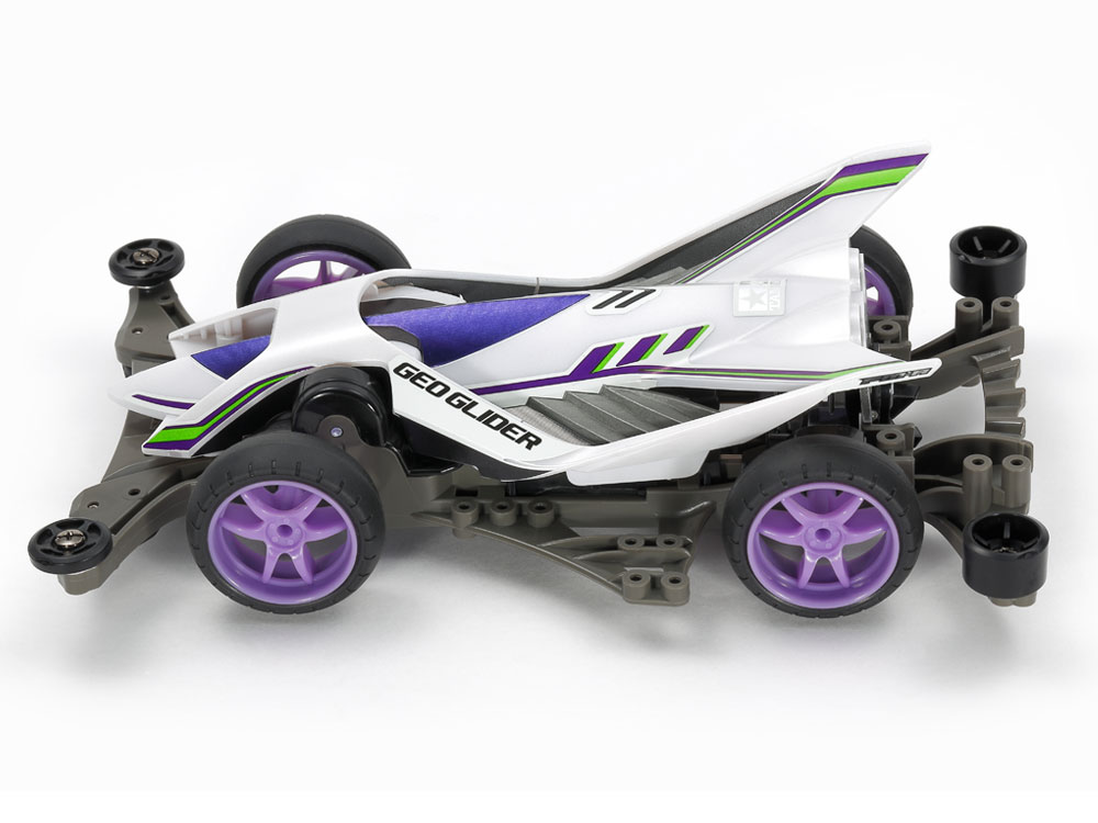 This assembly kit creates the Geo Glider, a sleek Mini 4WD car with a body which won the TAMIYA AWARD in the 2018 Mini 4WD Design Contest held in Japan. Its honed silhouette features lines you’d expect to see on a fighter jet, complete with a distinctive X-shaped cowl over the cockpit. The body is molded in pearl white ABS resin, and can be decorated with the included stickers for logos and other graphics.