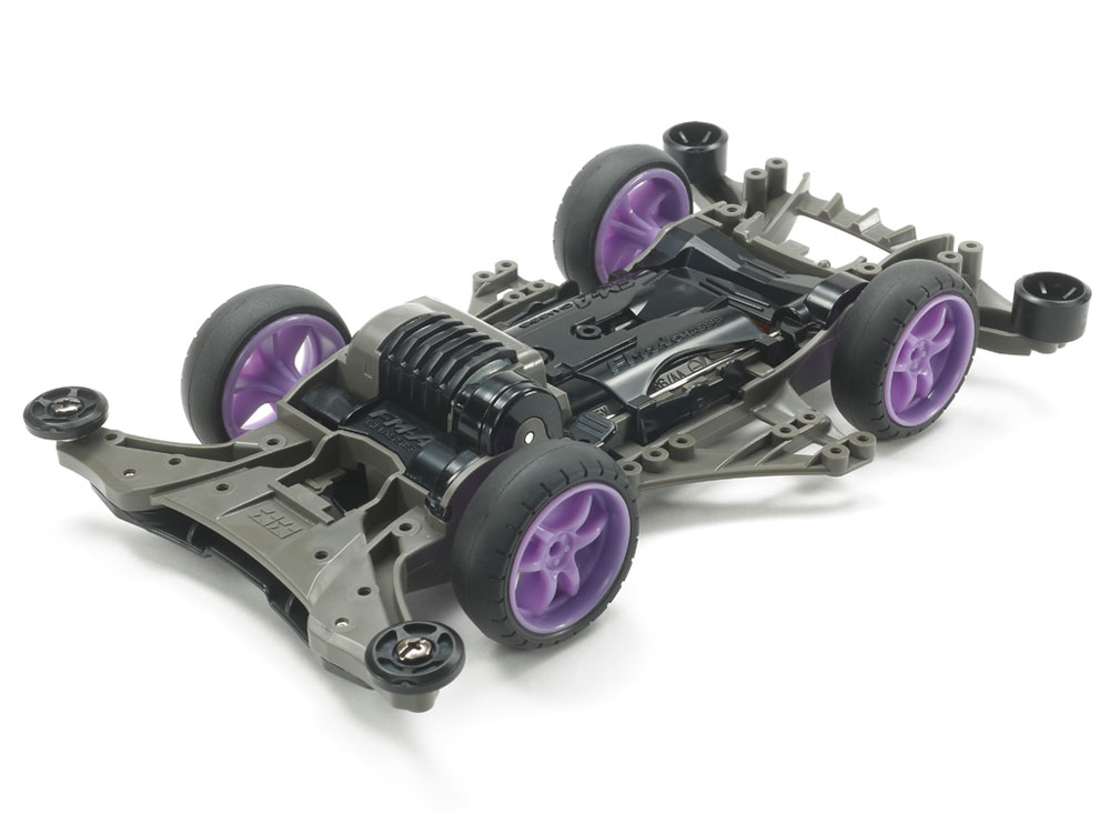 The FM-A chassis is a front motor unit with advanced aerodynamic themes that – thanks to its center of gravity toward the front – is at home on a whole variety of track types including those with frequent elevation changes. It comes equipped with a low-friction front skid bar, while the chassis underside allows easy access to the motor and quick setup changes. Aircraft-inspired aero side stays allow attachment of a range of Grade-Up parts. The chassis is molded in durable olive gray ABS, with low friction A parts such as underpanel in black. Purple large-diameter V-spoke wheels are combined with arched tires, and the model includes a motor and 4.2:1 gears.